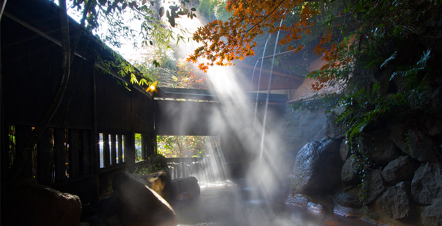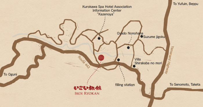 Starry night sky, green trees reflecting daylight caresses timeless, secluded village scenery. Situated in the heart of “Kurokawa Spa”, “Ikoi Ryokan” welcomes you with artless coziness of long wood corridor, thick log beam, bath with thatched roof, and ash-fireplace. Your soul consoled in Japanese tranquility with one of national best 100 hot springs “Water Fall Spa”, open-air bath for mixed bathing and “Beauty Spa”, only for ladies.